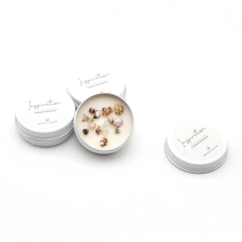 *Inspiration* ist mit dem Stein Ozeanchalcedon bestreut. [Ozeanchalcedon bringt Ideenfülle und Begeisterung. Er fördert die Verarbeitung innerer Bilder, den Sinn für Ästhetik und bündelt Energie. So begibst Du Dich ungezwungen und gelöst auf Deinen Weg.]