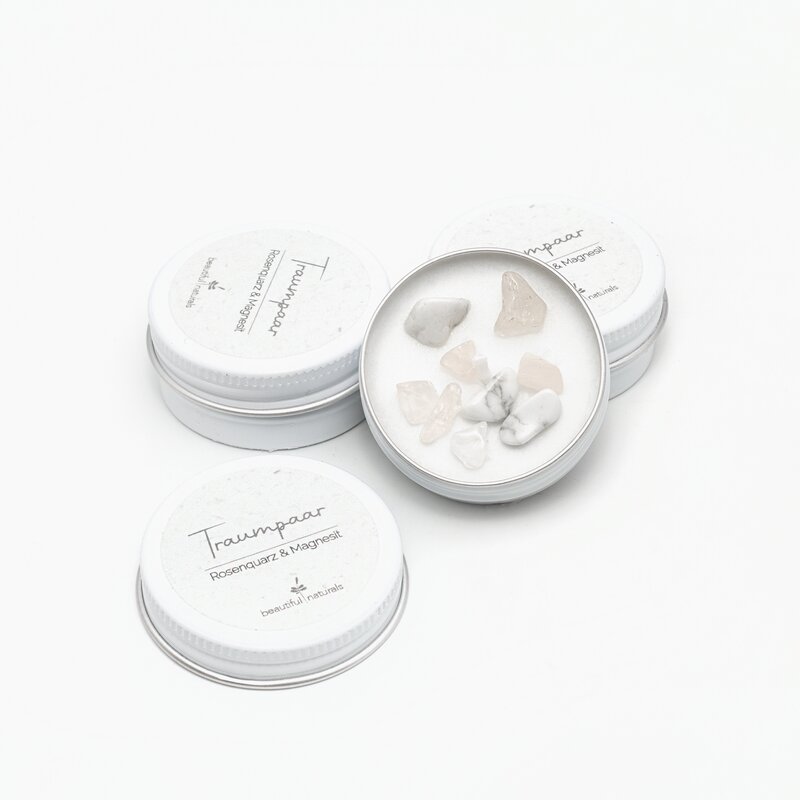 *Traumpaar* ist mit den Steinen Rosenquarz und Magnesit bestreut. [Magnesit regt die bedingungslose Liebe an und bringt Leidenschaft und Hingabe in die Beziehung. Rosenquarz übernimmt als Stein des Herzens die Harmonie zwischen Euch. "Dieses Duo ist Liebe pur!"]