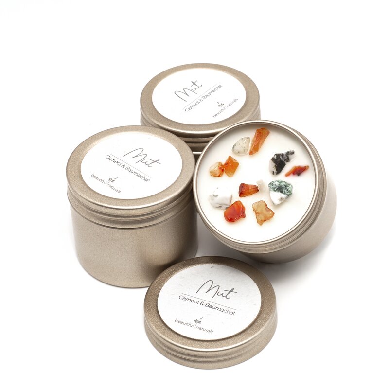 *Mut* ist mit den Steinen Carneol und Baumachat bestreut. [Carneol gibt gesundes Selbstvertrauen und Standfestigkeit, um sich allen Widrigkeiten des Lebens zu stellen. Baumachat lässt Dich Schwierigkeiten als Herausforderung betrachten. Unsere "Power-Kombi."]