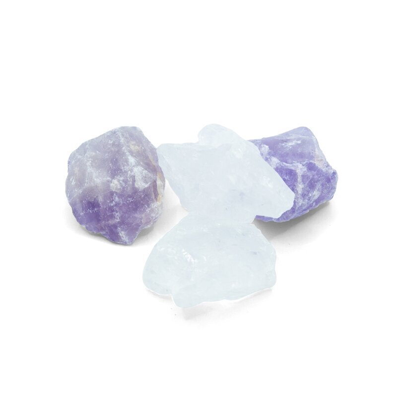 Diese Wasserstein-Mischung kombiniert Bergkristall und Amethyst. Die ausgewählten Rohsteine stehen für Bewusstheit, Entwicklung und geistige Wachheit.