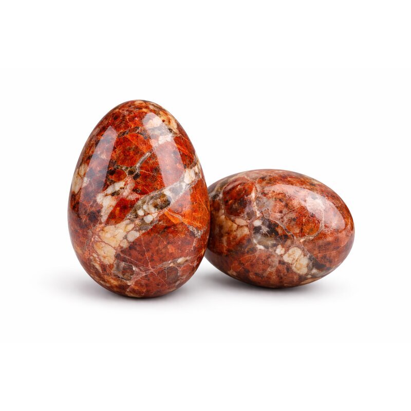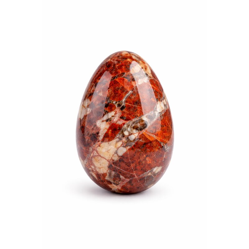Dieses Yoni-Ei aus Brekzienjaspis zeigt die typische, lebendige Struktur dieses besonderen Minerals. Rote, braune und cremefarbene Gesteinsanteile verbinden sich zu einer charakteristischen, mosaikartigen Zeichnung.