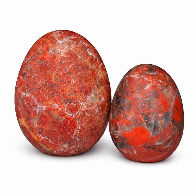Dieses Yoni-Ei aus Brekzienjaspis zeigt die typische, lebendige Struktur dieses besonderen Minerals. Rote, braune und cremefarbene Gesteinsanteile verbinden sich zu einer charakteristischen, mosaikartigen Zeichnung.