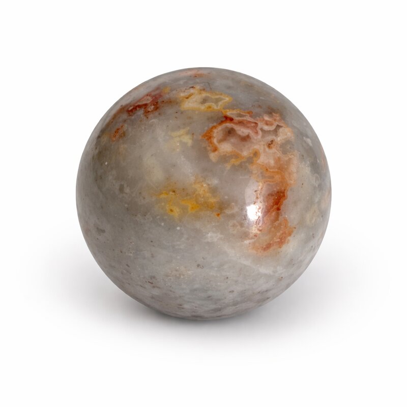 Diese Kugel aus Crazy Lace Achat zeigt eine lebendige, vielschichtige Zeichnung mit geschwungenen Linien und natürlichen Mustern. Die Farbgebung reicht von warmen Creme- und Beigetönen bis zu kräftigeren Kontrasten. Die polierte Oberfläche bringt die feinen Strukturen besonders gut zur Geltung. Durch die runde Form entsteht eine harmonische Wirkung, die die dynamische Zeichnung sanft ausgleicht.