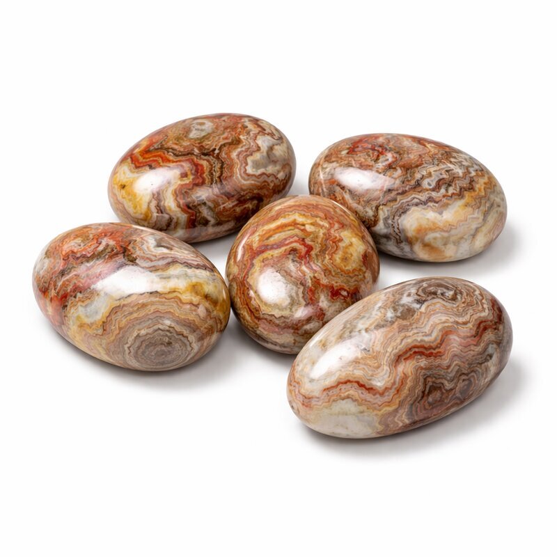 Dieser Trommelstein zeigt lebendige, oft verspielte Muster in warmen Beige-, Creme-, Grau- und Rottönen, die sich in schwungvollen Linien über den Stein ziehen. Die charakteristische, „tänzelnde“ Zeichnung verleiht dem Crazy Lace Achat eine dynamische und zugleich harmonische Ausstrahlung.