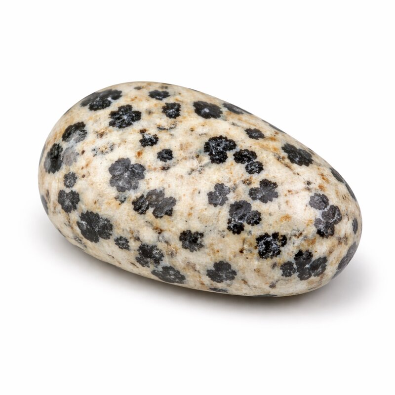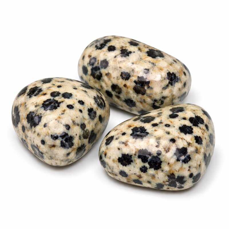 Dieser Trommelstein zeigt die typische, kontrastreiche Musterung aus hellen Grundtönen mit dunklen Einschlüssen, die an das Fell eines Dalmatiners erinnern. Die natürliche Zeichnung verleiht dem Stein eine lebendige und zugleich harmonische Ausstrahlung, die durch die glatte Politur besonders schön betont wird.