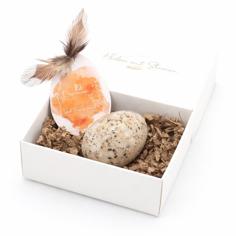 Die glatte, polierte Oberfläche bringt die natürlichen Zeichnungen des Steins besonders gut zur Geltung. Als Dekorationsstück, Handschmeichler oder besonderes Geschenk zieht dieses Edelstein-Ei ruhig und harmonisch den Blick auf sich.