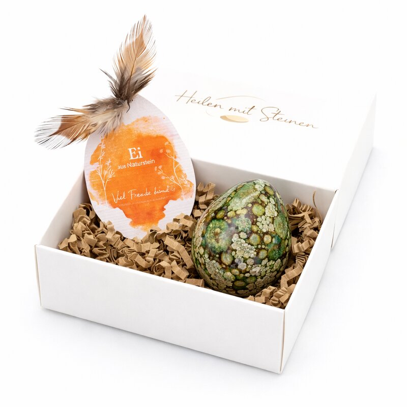 Die glatte, polierte Oberfläche bringt die feinen Farbnuancen des Steins besonders schön zur Geltung. Als Dekorationsstück, Handschmeichler oder Sammlerstück wirkt dieses Edelstein-Ei ruhig, elegant und natürlich.