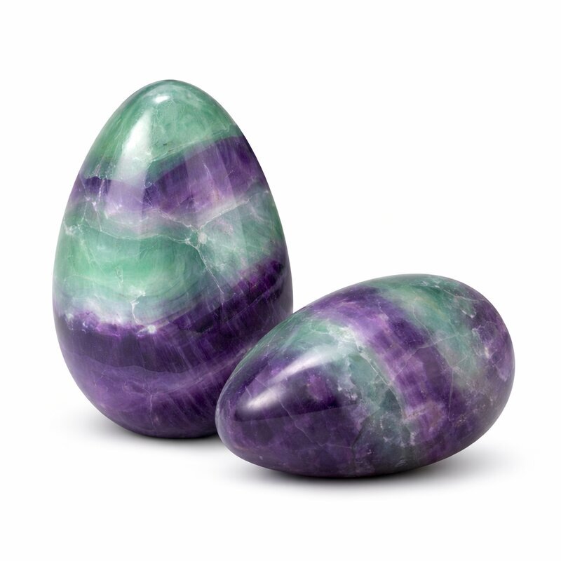 Edelstein-Ei aus Fluorit mit grünen und violetten Farbverläufen. Beliebt als Handschmeichler, Dekoration oder Sammlerstück aus Naturstein.