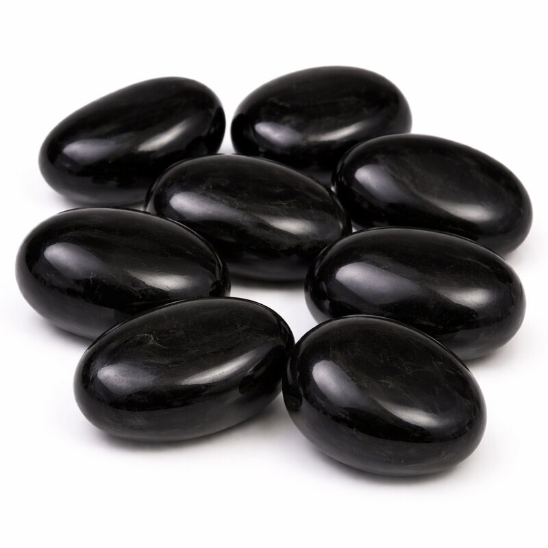 Trommelstein aus Gagat. Tiefschwarzer Naturstein mit glatter Oberfläche, ruhig und klar in der Ausstrahlung, elegant und kraftvoll.