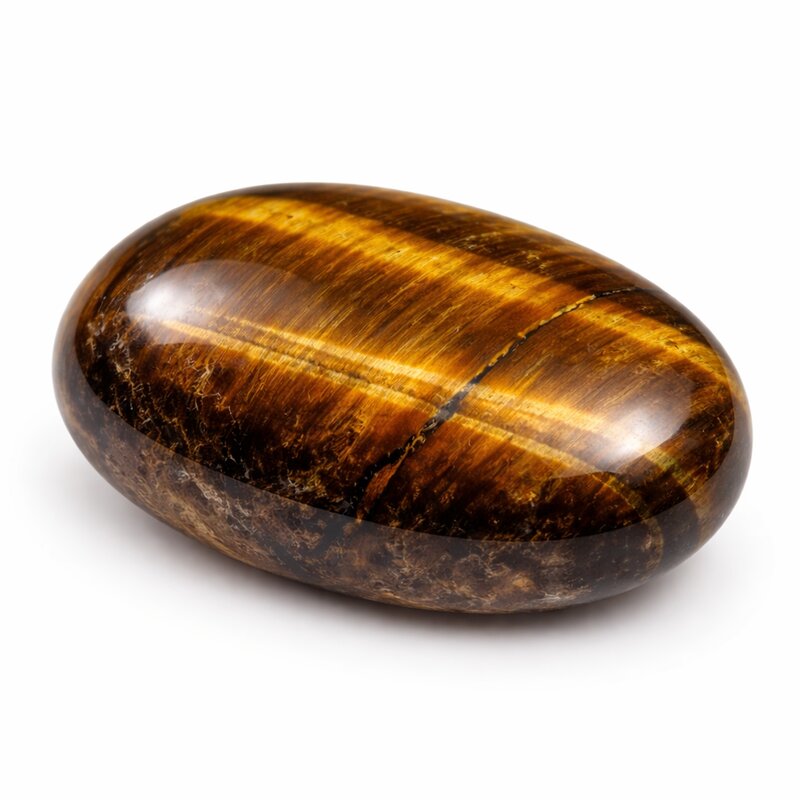 Das Tigerauge zeigt sich in warmen Braun- und Goldtönen mit seidigem Schimmer, der je nach Lichteinfall lebendig wirkt. Die charakteristischen Streifen und Lichtreflexe verleihen jedem Stein eine besondere Tiefe. Die Oberfläche ist glatt geschliffen, die Form weich und angenehm rund.