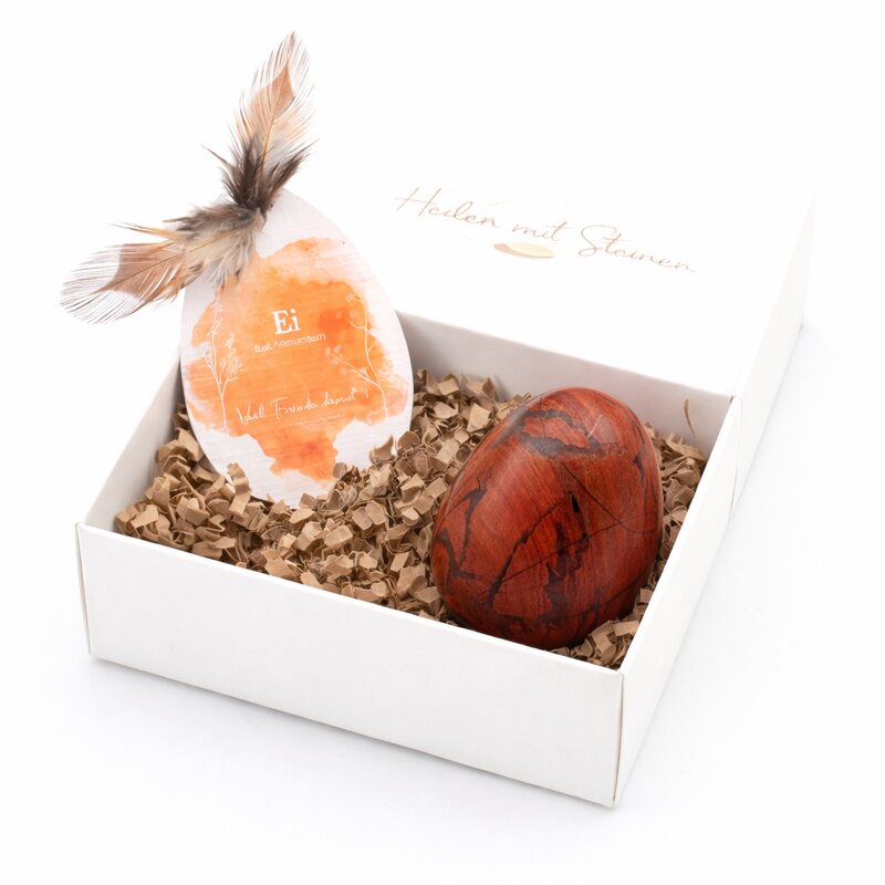 Dieses Yoni-Ei aus gebändertem Jaspis zeigt die charakteristischen Linien und Farbverläufe dieses besonderen Minerals. Die Farbtöne reichen von warmem Rot über Braun bis zu erdigen Nuancen, durchzogen von natürlichen Bändern und Strukturen.