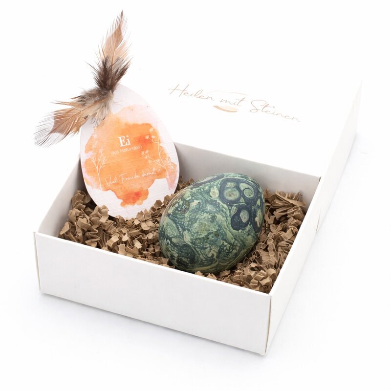 Durch die glatte Politur kommen die faszinierenden Strukturen besonders schön zur Geltung. Als Dekorationsstück, Handschmeichler oder Sammlerstück wirkt dieses Edelstein-Ei ruhig, kraftvoll und erdend.
