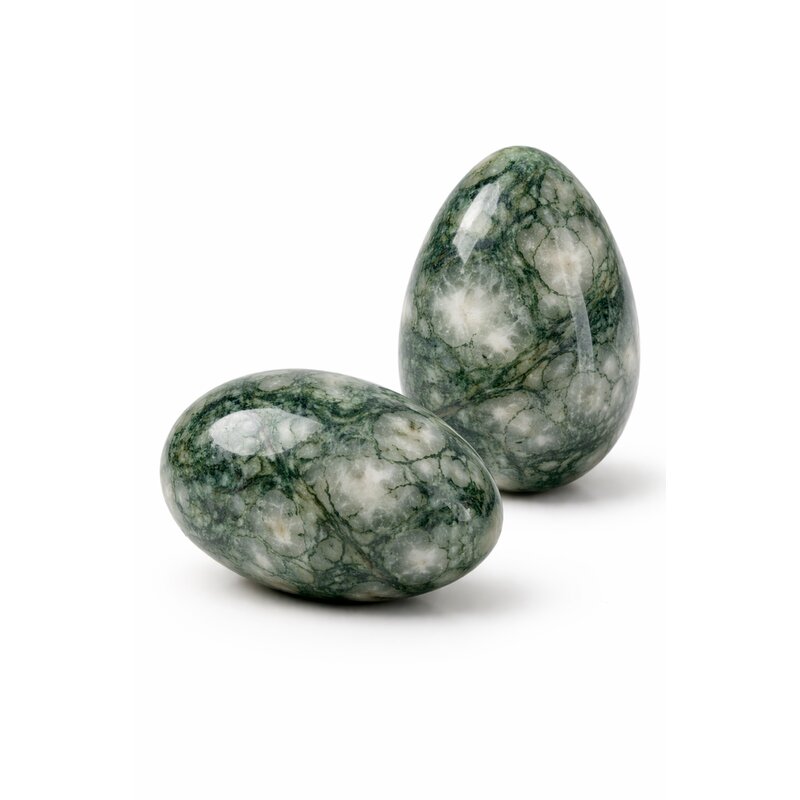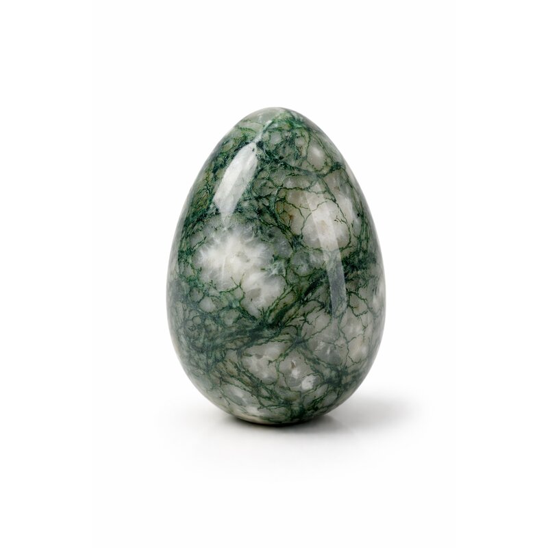 Dieses Edelstein-Ei aus Moosachat zeigt die typischen grünen Einschlüsse dieses besonderen Minerals. Die Farbpalette reicht von klaren bis milchigen Grundtönen, durchzogen von moosartigen Strukturen, die jedem Stück eine lebendige und natürliche Ausstrahlung verleihen.