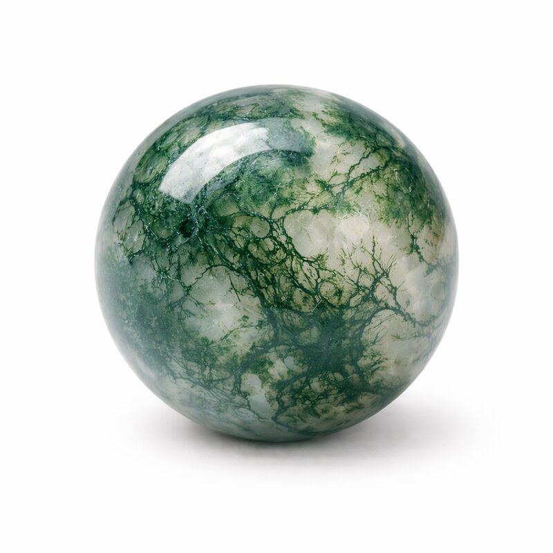 Diese Kugel aus Moosachat zeigt eine klare bis leicht milchige Grundstruktur mit feinen, moosartigen Einschlüssen in Grün- und Naturtönen. Die Muster wirken wie kleine Landschaften oder pflanzliche Strukturen und verleihen jedem Stein eine lebendige, natürliche Ausstrahlung. Die polierte Oberfläche bringt diese feinen Details besonders schön zur Geltung. Durch die runde Form entsteht eine ruhige, ausgewogene Wirkung.
