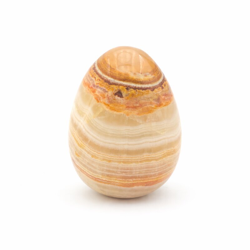 Dieses Edelstein-Ei aus Onyxmarmor zeigt die typische, weich gebänderte Struktur dieses besonderen Minerals. Die Farben reichen von hellen Creme- und Beigetönen bis zu warmen Braun- und Honignuancen, oft durchzogen von natürlichen Linien und Schichten.