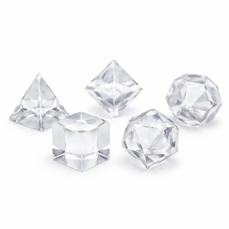 Dieses Set besteht aus den fünf platonischen Körpern aus Bergkristall. Die geometrisch geschliffenen Formen zeigen klare Kanten und eine transparente, lichtdurchlässige Ausstrahlung, die je nach Stein durch feine Einschlüsse oder natürliche Strukturen ergänzt wird. Jeder Körper steht für ein Element und bringt eine eigene Qualität in das Gesamtbild. Die Formen wirken ruhig, präzise und gleichzeitig kraftvoll in ihrer Präsenz.
