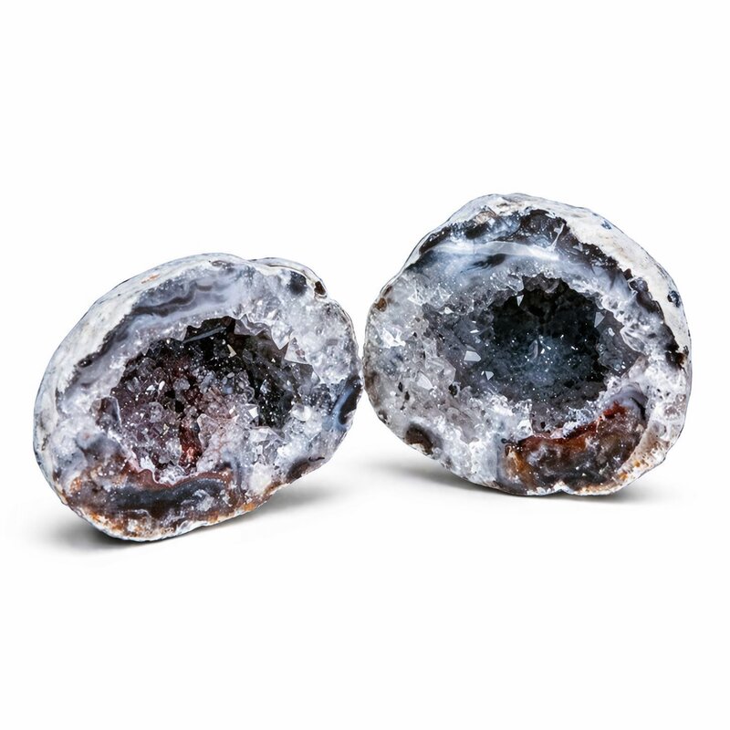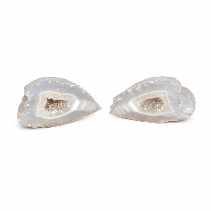 Dieses halbierte Achat-Geodenpaar besteht aus zwei zueinander passenden Hälften, die gemeinsam ein stimmiges Gesamtbild ergeben. Die offenen Schnittflächen zeigen feine, natürliche Bänderungen, die sich spiegeln oder ergänzen können. Außen bleibt die ursprüngliche, raue Struktur erhalten, während die Innenseiten die typische Zeichnung des Achats sichtbar machen. Jedes Paar wirkt wie ein kleines, gewachsenes Zusammenspiel aus Form und Struktur.