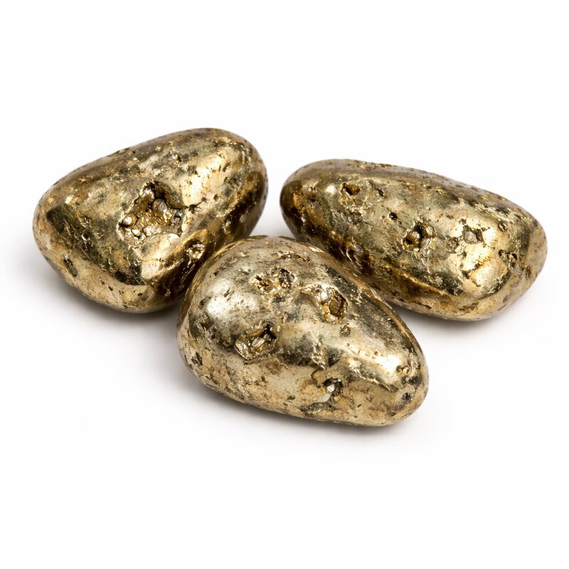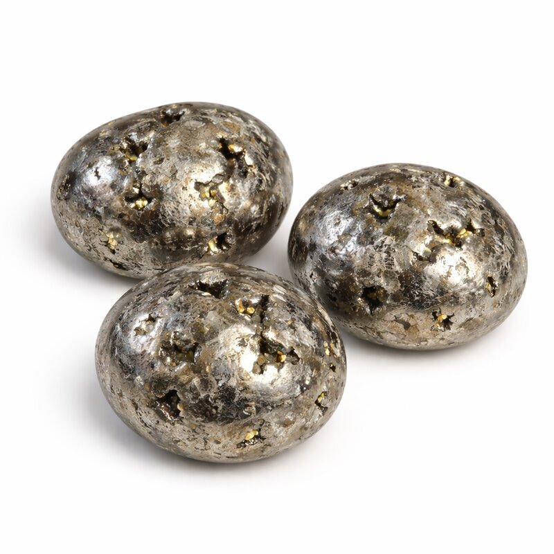 Diese Trommelsteine zeigen den typischen metallischen Glanz des Pyrit mit silbrig-goldenen Nuancen. Die Oberfläche ist geglättet und dennoch leicht strukturiert, wodurch das Licht lebendig reflektiert wird. Kleine Vertiefungen oder natürliche Unregelmäßigkeiten sind charakteristisch und verleihen jedem Stein seinen eigenen Ausdruck. Jeder Stein wirkt markant, kraftvoll und individuell.