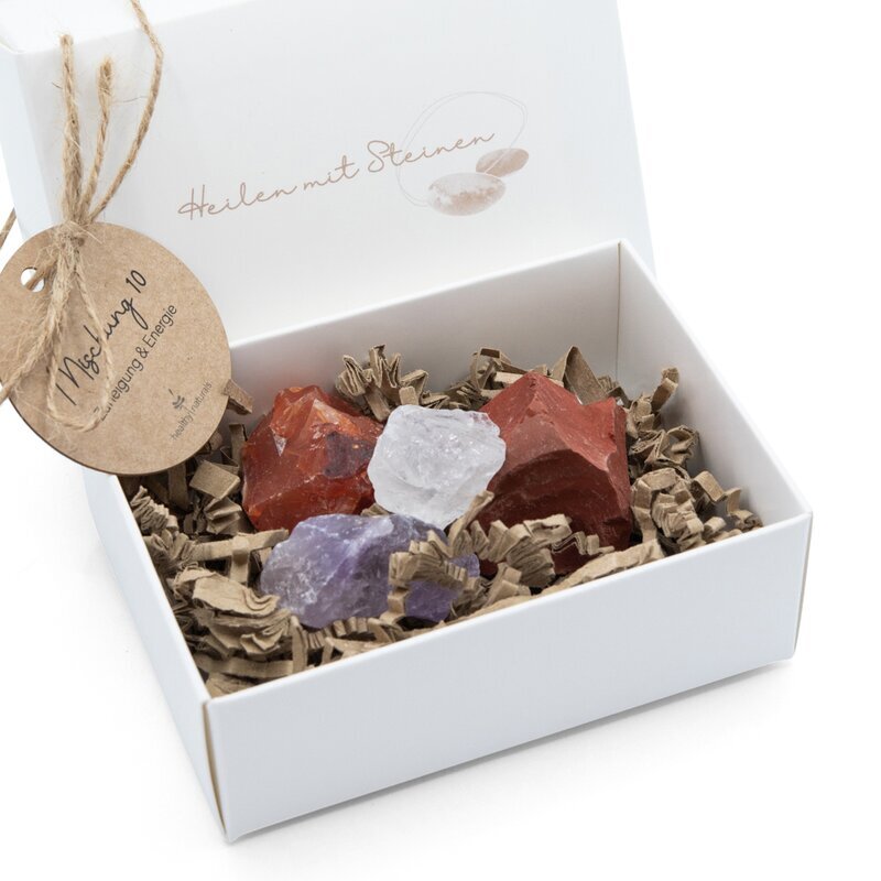 Diese Wasserstein-Mischung kombiniert Amethyst, Bergkristall, Carneol und Jaspis rot. Die ausgewählten Rohsteine ergänzen sich in ihren energetischen Qualitäten und verbinden Inspiration, Bewusstheit, Begegnung und Durchhaltevermögen.