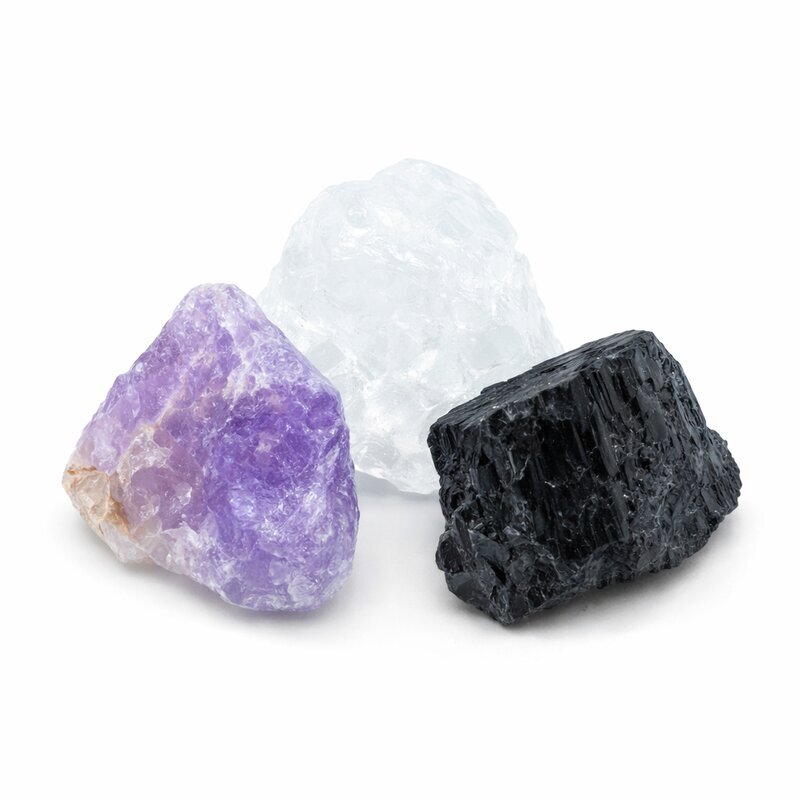 Wasserstein Mischung 7: Schutz und Befreiung mit Bergkristall, Amethyst und Turmalin zur Aufladung von Trinkwasser.