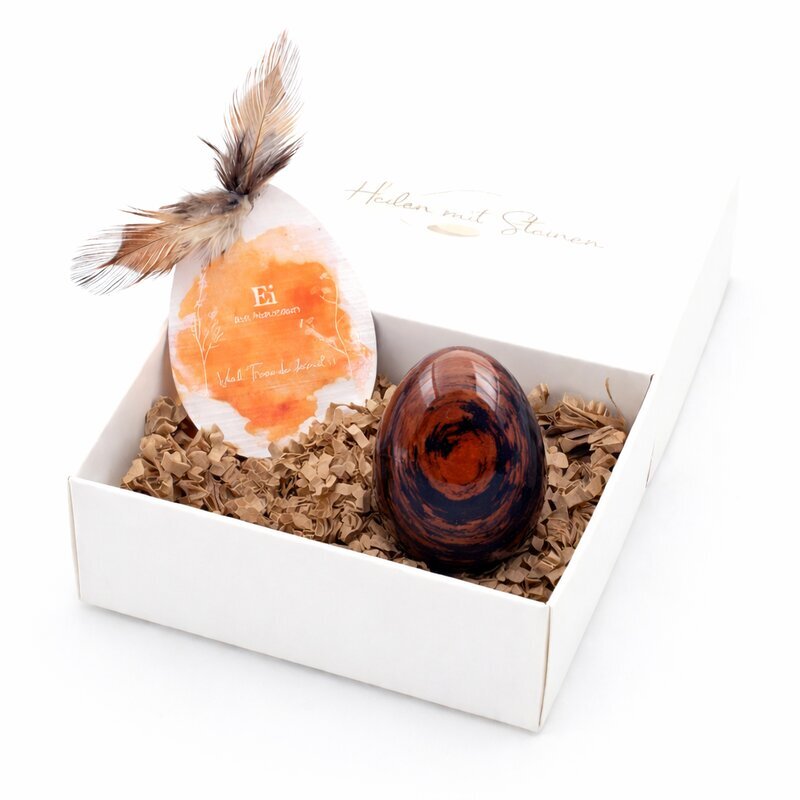 Dieses Yoni-Ei aus Mahagoniobsidian zeigt die typische braunrote Farbstruktur mit dunklen Anteilen. Die natürliche Maserung macht jedes Ei zu einem individuellen Naturstück.